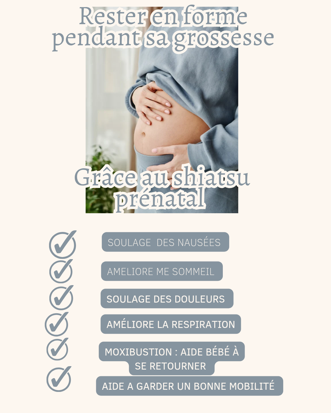Le shiatsu va vous aider à réduire les nausées, l’essoufflement, les douleurs, le sommeil…, maintenir une bonne mobilité jusqu’à l’accouchement, et favoriser le retournement de bébé grâce à la moxibustion.